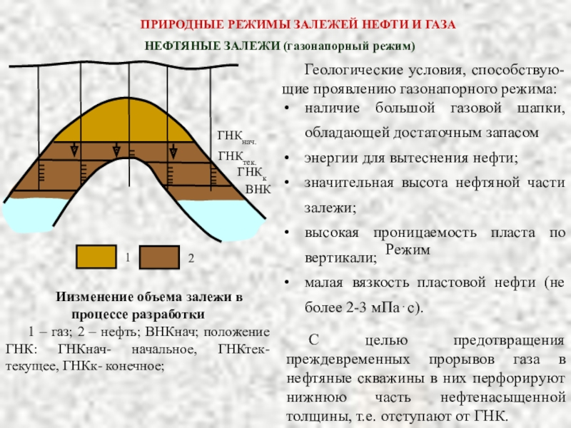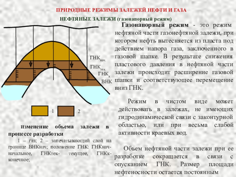 1 – газ; 2 – нефть; ВНКнач; положение ГНК: ГНКнач- начальное, ГНКтек- текущее, ГНКк- конечное;