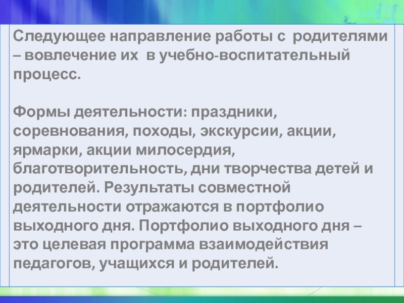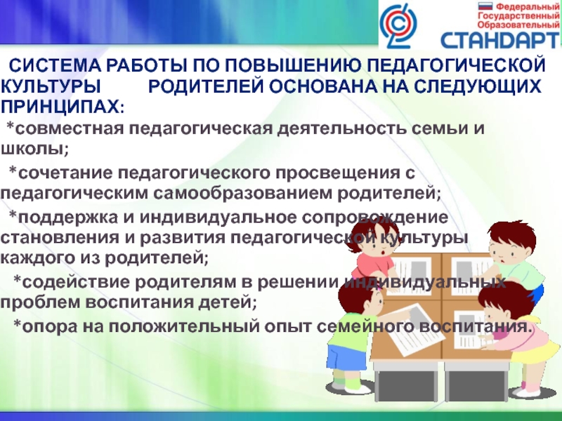 *сочетание педагогического просвещения с педагогическим самообразованием родителей;