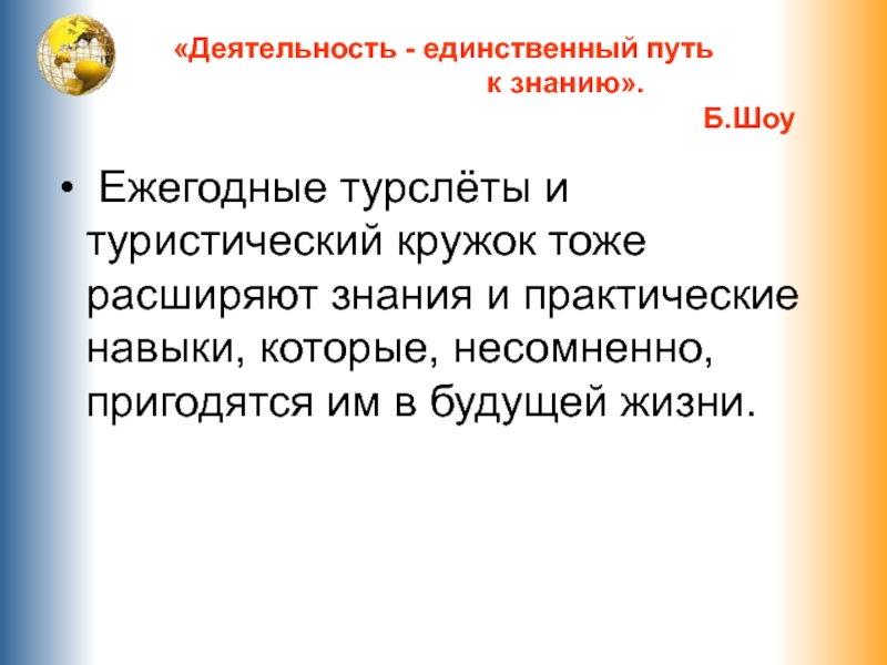 Ежегодные турслёты и туристический кружок тоже расширяют знания и практические навыки, которые, несомненно, пригодятся им в будущей жизни.