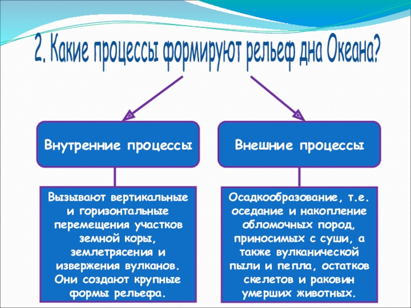 Осадкообразование, т.е. оседание и накопление обломочных пород, приносимых с суши, а также вулканической пыли и пепла, остатков скелетов и раковин умерших животных.