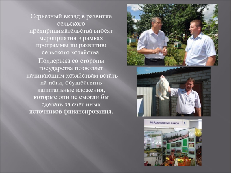 Слайд 24Серьезный вклад в развитие сельского предпринимательства вносят мероприятия в рамках программы