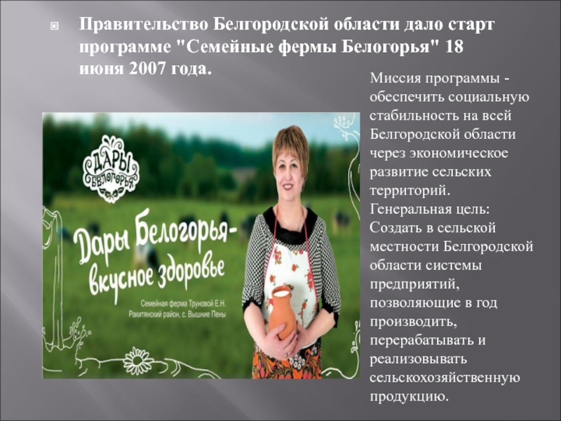 Слайд 5Правительство Белгородской области дало старт программе "Семейные фермы Белогорья" 18 июня