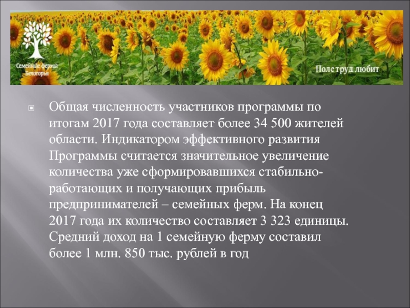 500 жителей области. Индикатором эффективного развития Программы считается значительное увеличение количества уже сформировавшихся стабильно-работающих и получающих прибыль предпринимателей – семейных ферм. На конец 2017 года их количество составляет 3 323 единицы. Средний доход на 1 семейную ферму составил более 1 млн. 850 тыс. рублей в год
