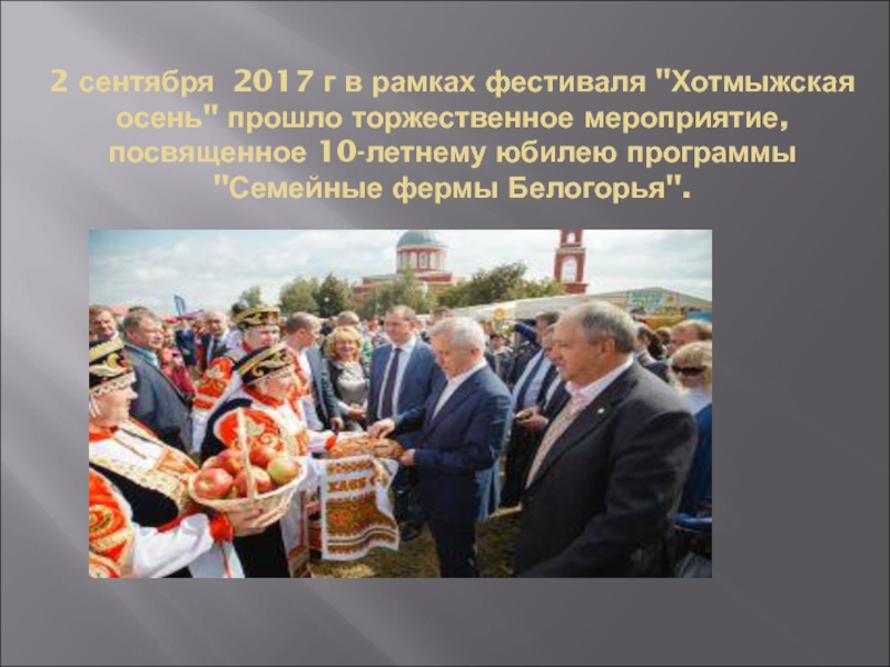 Слайд 102 сентября 2017 г в рамках фестиваля "Хотмыжская осень" прошло торжественное