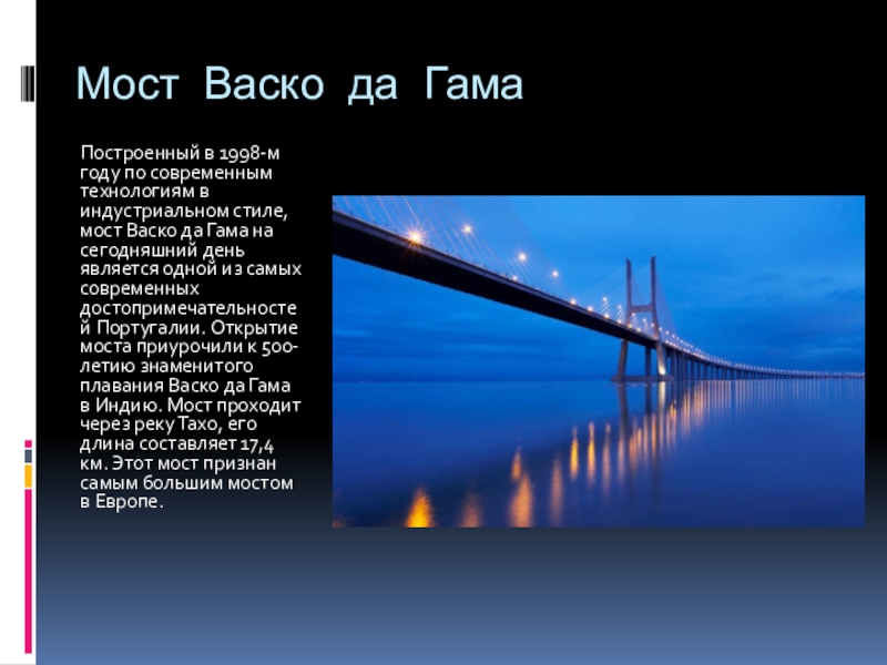 индустриальном стиле, мост Васко да Гама на сегодняшний день является одной из самых современных достопримечательностей Португалии. Открытие моста приурочили к 500-летию знаменитого плавания Васко да Гама в Индию. Мост проходит через реку Тахо, его длина составляет 17,4 км. Этот мост признан самым большим мостом в Европе.