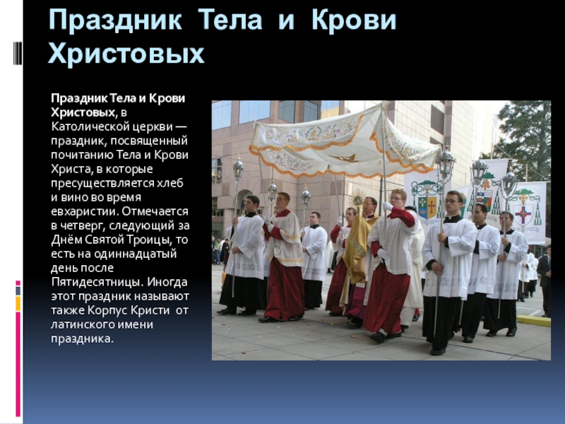 церкви — праздник, посвященный почитанию Тела и Крови Христа, в которые пресуществляется хлеб и вино во время евхаристии. Отмечается в четверг, следующий за Днём Святой Троицы, то есть на одиннадцатый день после Пятидесятницы. Иногда этот праздник называют также Корпус Кристи от латинского имени праздника.