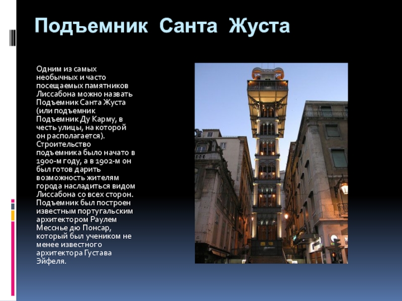 можно назвать Подъемник Санта Жуста (или подъемник Подъемник Ду Карму, в честь улицы, на которой он располагается). Строительство подъемника было начато в 1900-м году, а в 1902-м он был готов дарить возможность жителям города насладиться видом Лиссабона со всех сторон. Подъемник был построен известным португальским архитектором Раулем Месснье дю Понсар, который был учеником не менее известного архитектора Густава Эйфеля.