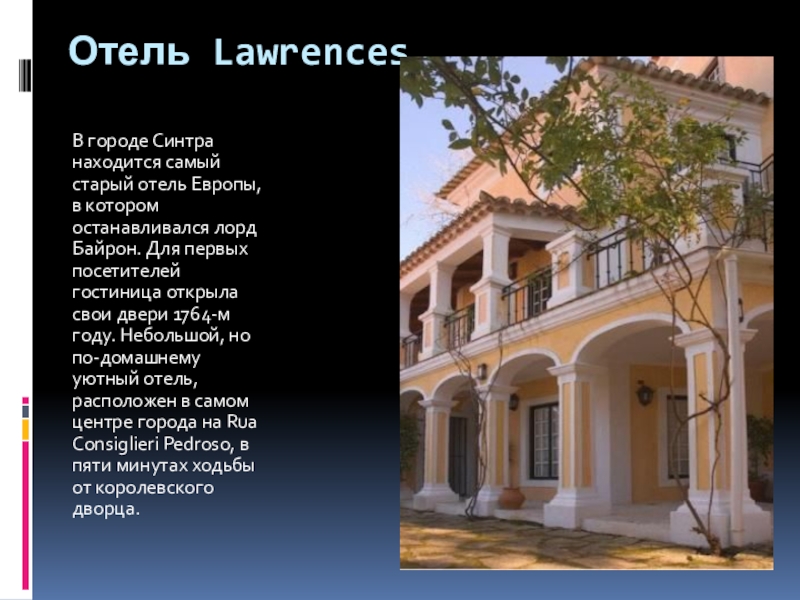 останавливался лорд Байрон. Для первых посетителей гостиница открыла свои двери 1764-м году. Небольшой, но по-домашнему уютный отель, расположен в самом центре города на Rua Consiglieri Pedroso, в пяти минутах ходьбы от королевского дворца.