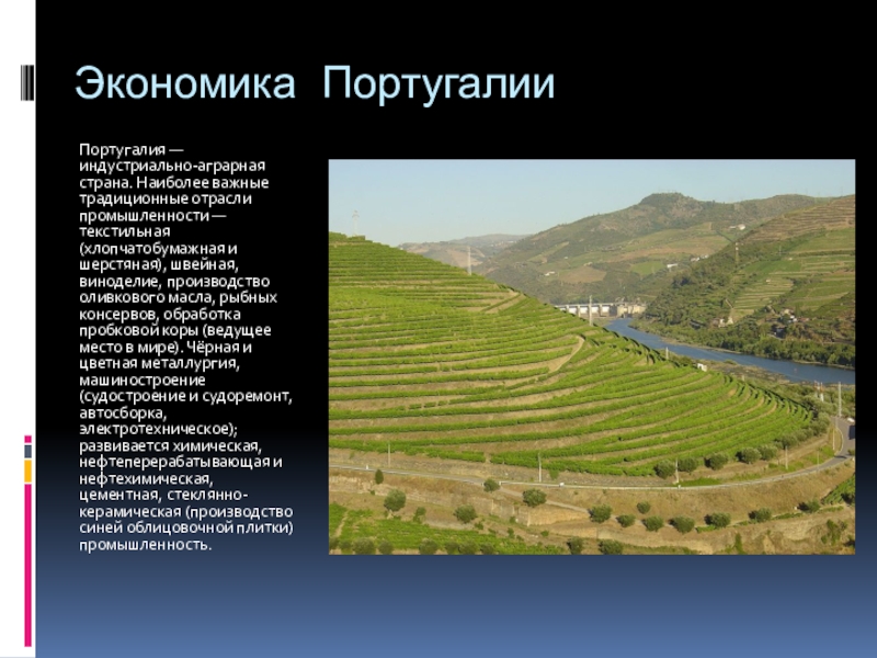 Португалия — индустриально-аграрная страна. Наиболее важные традиционные отрасли промышленности —