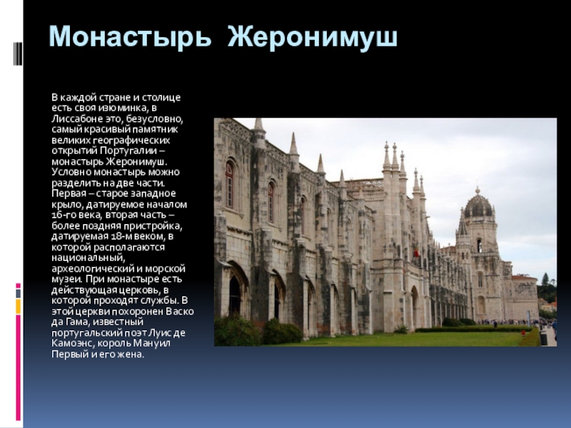 это, безусловно, самый красивый памятник великих географических открытий Португалии – монастырь Жеронимуш. Условно монастырь можно разделить на две части. Первая – старое западное крыло, датируемое началом 16-го века, вторая часть – более поздняя пристройка, датируемая 18-м веком, в которой располагаются национальный, археологический и морской музеи. При монастыре есть действующая церковь, в которой проходят службы. В этой церкви похоронен Васко да Гама, известный португальский поэт Луис де Камоэнс, король Мануил Первый и его жена.