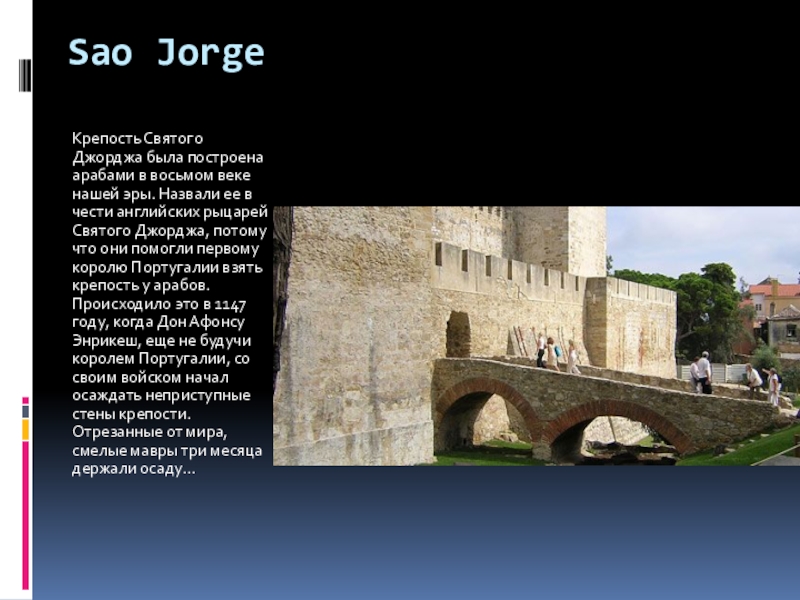 эры. Назвали ее в чести английских рыцарей Святого Джорджа, потому что они помогли первому королю Португалии взять крепость у арабов. Происходило это в 1147 году, когда Дон Афонсу Энрикеш, еще не будучи королем Португалии, со своим войском начал осаждать неприступные стены крепости. Отрезанные от мира, смелые мавры три месяца держали осаду...