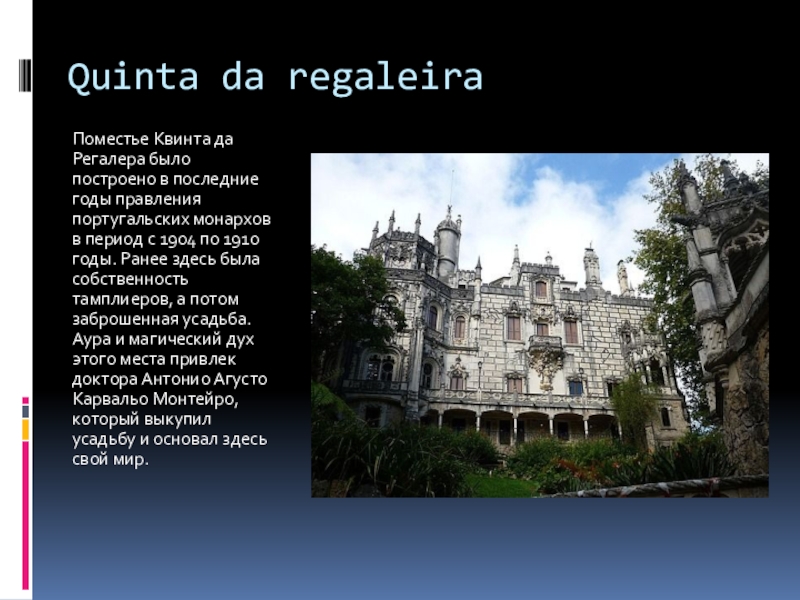 правления португальских монархов в период с 1904 по 1910 годы. Ранее здесь была собственность тамплиеров, а потом заброшенная усадьба. Аура и магический дух этого места привлек доктора Антонио Агусто Карвальо Монтейро, который выкупил усадьбу и основал здесь свой мир.