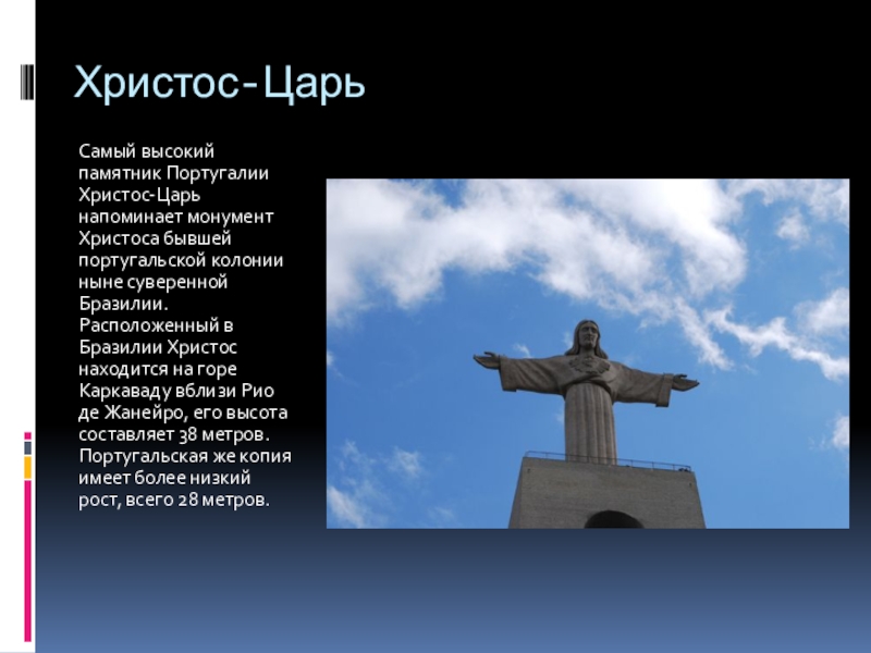 ныне суверенной Бразилии. Расположенный в Бразилии Христос находится на горе Каркаваду вблизи Рио де Жанейро, его высота составляет 38 метров. Португальская же копия имеет более низкий рост, всего 28 метров.