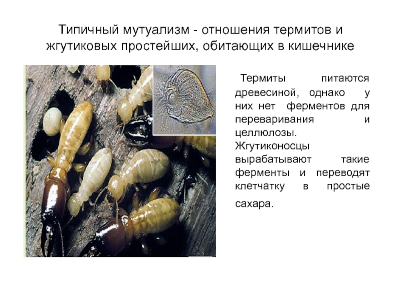 Слайд 11Типичный мутуализм - отношения термитов и жгутиковых простейших, обитающих в кишечнике