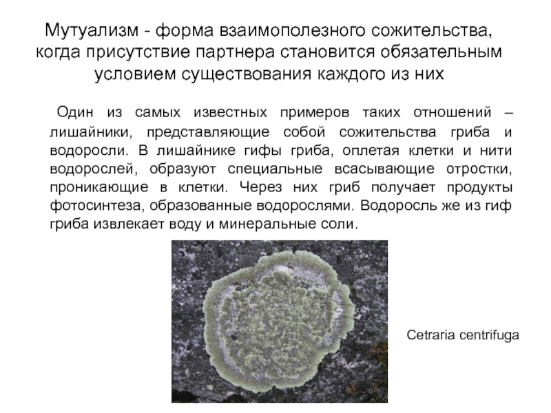 Слайд 10Мутуализм - форма взаимополезного сожительства, когда присутствие партнера становится обязательным условием