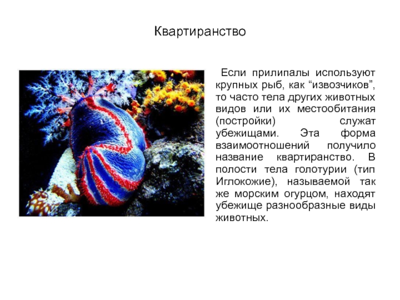 животных видов или их местообитания (постройки) служат убежищами. Эта форма взаимоотношений получило название квартиранство. В полости тела голотурии (тип Иглокожие), называемой так же морским огурцом, находят убежище разнообразные виды животных.