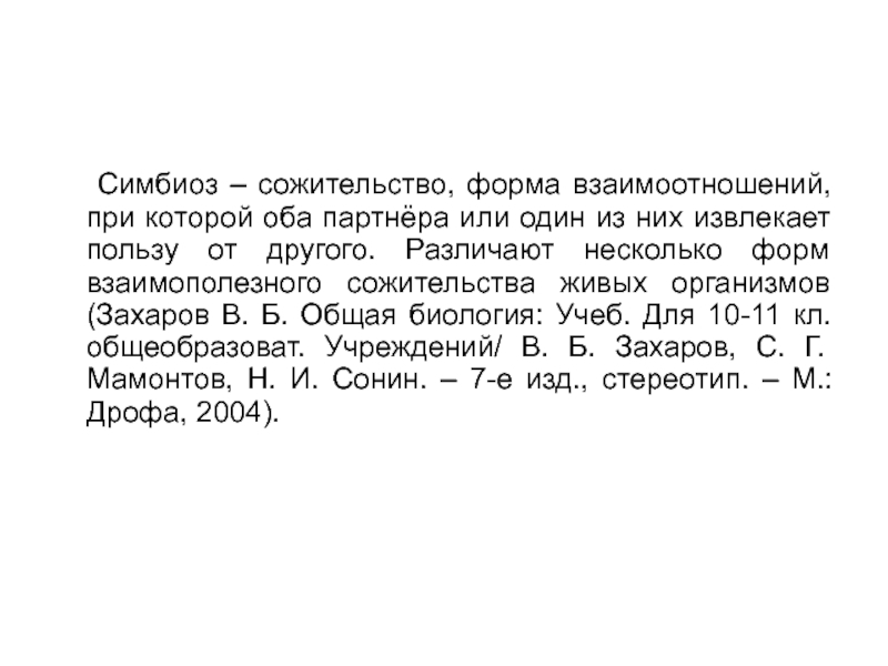 Слайд 2 Симбиоз – сожительство, форма взаимоотношений, при которой оба партнёра или один