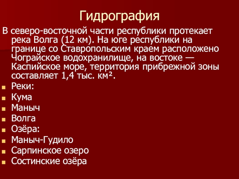 республики на границе со Ставропольским краем расположено Чограйское водохранилище, на востоке — Каспийское море, территория прибрежной зоны составляет 1,4 тыс. км².