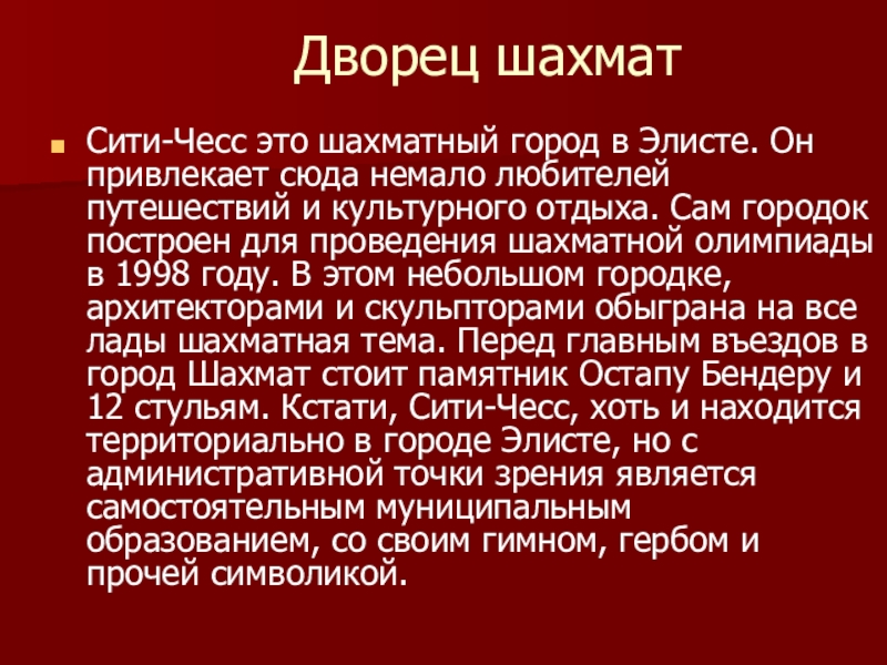 привлекает сюда немало любителей путешествий и культурного отдыха. Сам городок построен для проведения шахматной олимпиады в 1998 году. В этом небольшом городке, архитекторами и скульпторами обыграна на все лады шахматная тема. Перед главным въездов в город Шахмат стоит памятник Остапу Бендеру и 12 стульям. Кстати, Сити-Чесс, хоть и находится территориально в городе Элисте, но с административной точки зрения является самостоятельным муниципальным образованием, со своим гимном, гербом и прочей символикой.