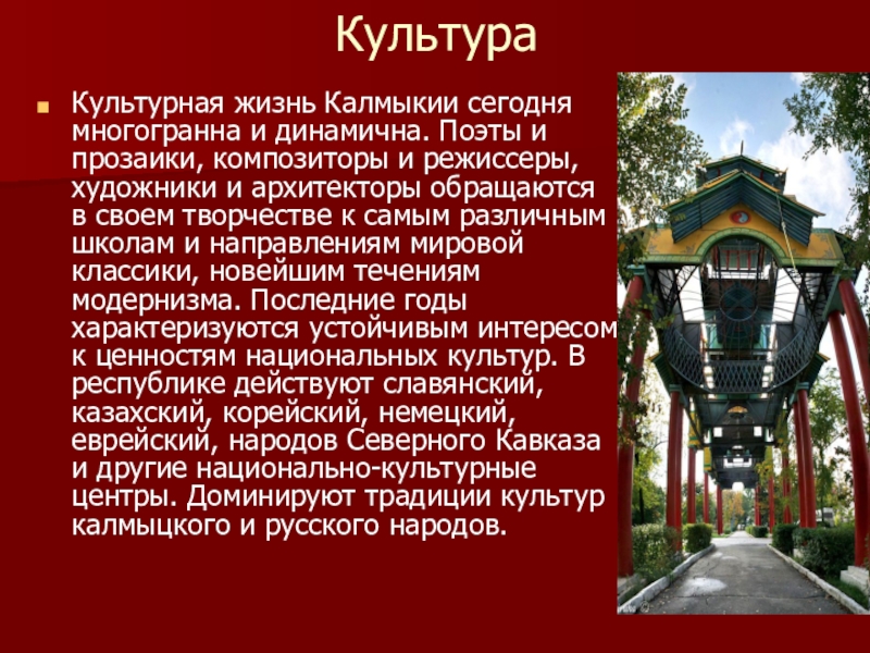 и режиссеры, художники и архитекторы обращаются в своем творчестве к самым различным школам и направлениям мировой классики, новейшим течениям модернизма. Последние годы характеризуются устойчивым интересом к ценностям национальных культур. В республике действуют славянский, казахский, корейский, немецкий, еврейский, народов Северного Кавказа и другие национально-культурные центры. Доминируют традиции культур калмыцкого и русского народов.