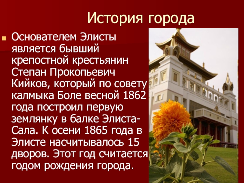 Степан Прокопьевич Кийков, который по совету калмыка Боле весной 1862 года построил первую землянку в балке Элиста-Сала. К осени 1865 года в Элисте насчитывалось 15 дворов. Этот год считается годом рождения города.