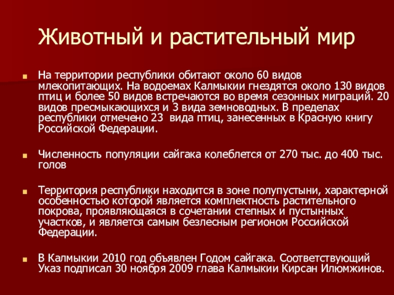 В Калмыкии 2010 год объявлен Годом сайгака. Соответствующий Указ подписал 30 ноября 2009 глава Калмыкии Кирсан Илюмжинов.