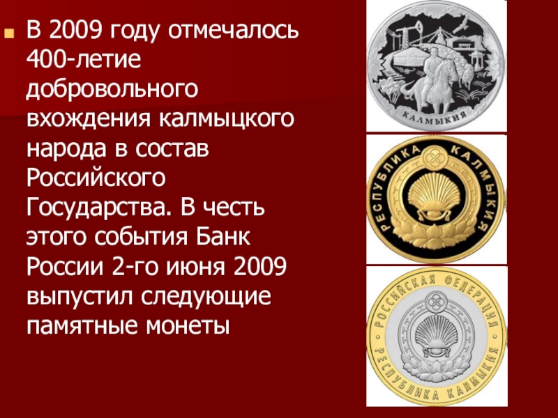 Слайд 13В 2009 году отмечалось 400-летие добровольного вхождения калмыцкого народа в состав