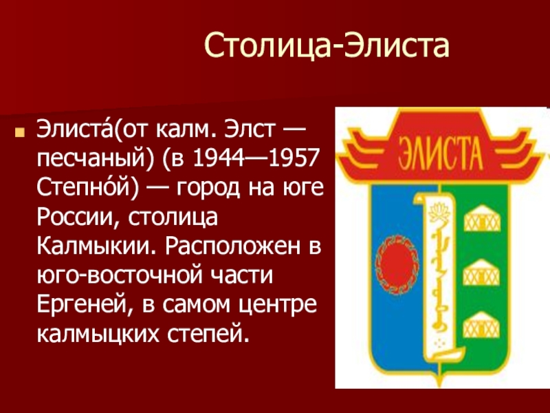 1944—1957 Степно́й) — город на юге России, столица Калмыкии. Расположен в юго-восточной части Ергеней, в самом центре калмыцких степей.