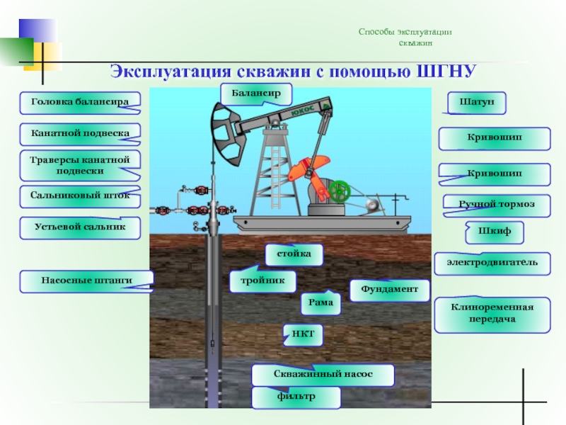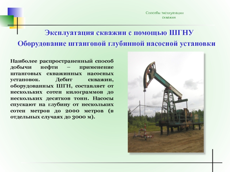 Наиболее распространенный способ добычи нефти – применение штанговых скважинных насосных установок. Дебит скважин, оборудованных ШГН, составляет от нескольких сотен килограммов до нескольких десятков тонн. Насосы спускают на глубину от нескольких сотен метров до 2000 метров (в отдельных случаях до 3000 м).