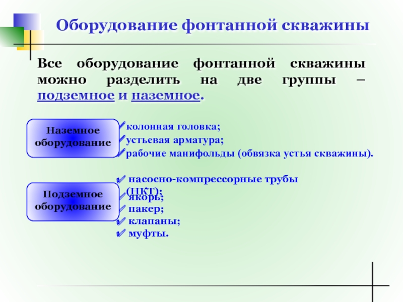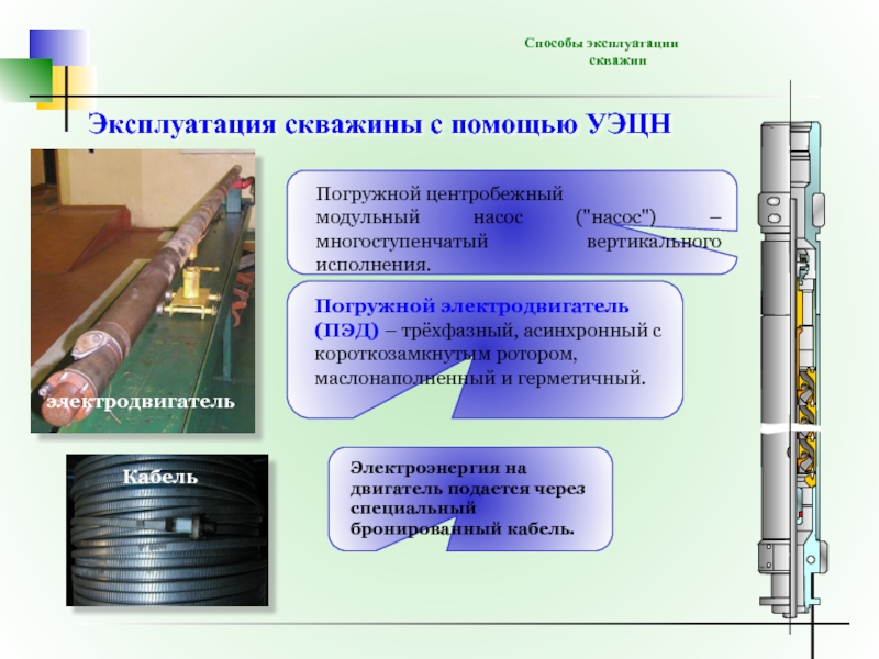 В наземное оборудование входит: фонтанная арматура, оборудованная кабельным вводом, сборный манифольд, а также наземное электрооборудование, включающее в себя станцию управления, трансформатор, клемную коробку, кабельную линию.