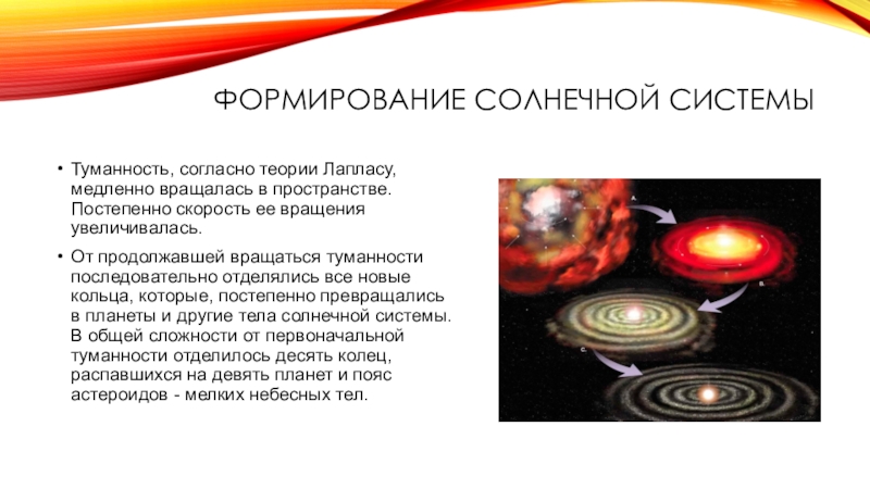Формирование солнечной системыТуманность, согласно теории Лапласу, медленно вращалась в пространстве. Постепенно скорость ее вращения увеличивалась. От продолжавшей
