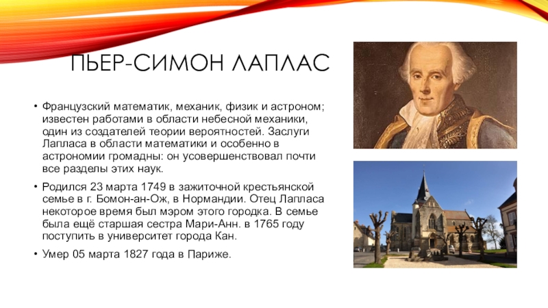 Пьер-Симон ЛапласФранцузский математик, механик, физик и астроном; известен работами в области небесной механики, один из создателей теории вероятностей. Заслуги Лапласа в области математики и особенно в астрономии громадны: он усовершенствовал почти все разделы этих наук.Родился 23