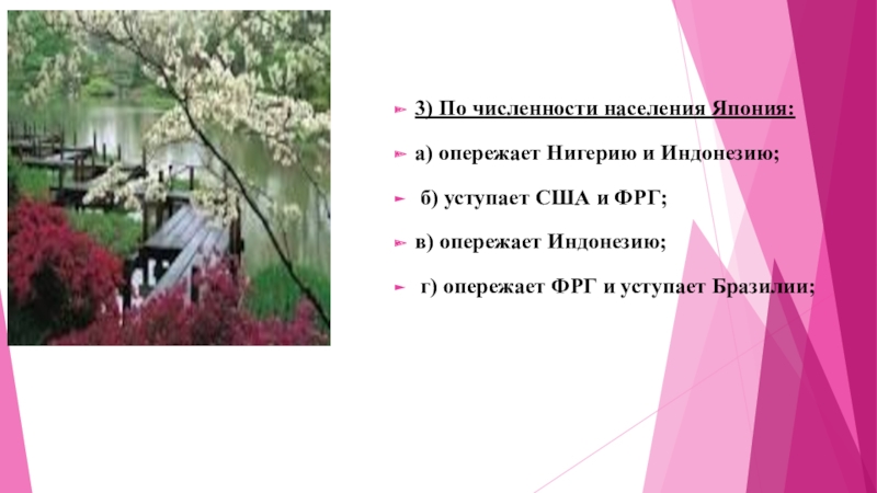 3) По численности населения Япония:а) опережает Нигерию и Индонезию; б) уступает США и ФРГ;в) опережает Индонезию;