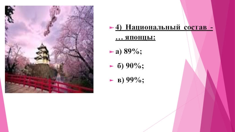 4) Национальный состав - … японцы:а) 89%; б) 90%; в) 99%;