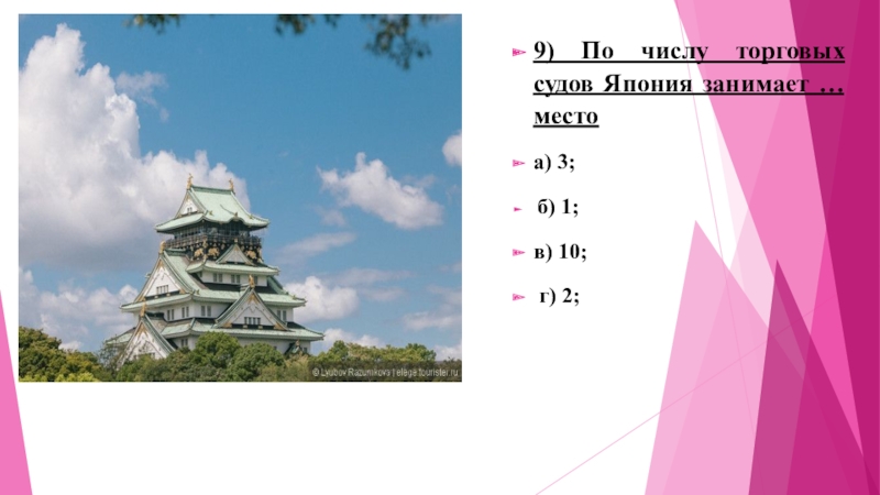 9) По числу торговых судов Япония занимает … местоа) 3; б) 1; в) 10;  г) 2;