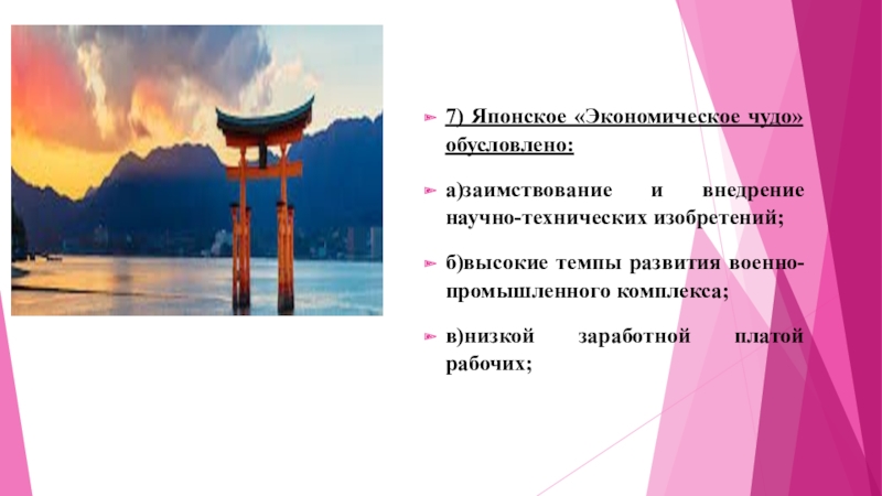 7) Японское «Экономическое чудо» обусловлено:а)заимствование и внедрение научно-технических изобретений;б)высокие темпы развития военно-промышленного комплекса;в)низкой заработной платой рабочих;