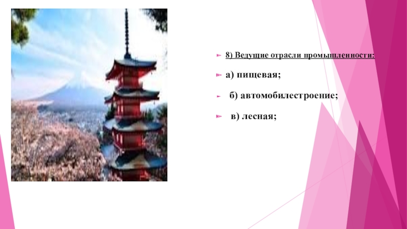 8) Ведущие отрасли промышленности:а) пищевая; б) автомобилестроение;  в) лесная;