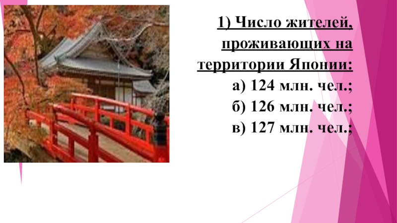1) Число жителей, проживающих на территории Японии: а) 124 млн. чел.;   б) 126 млн. чел.;