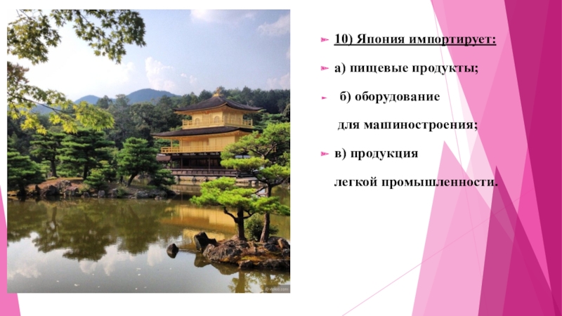 10) Япония импортирует:а) пищевые продукты;  б) оборудование для машиностроения;в) продукция легкой промышленности.