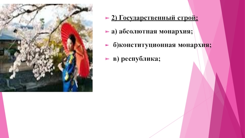 2) Государственный строй:а) абсолютная монархия; б)конституционная монархия; в) республика;