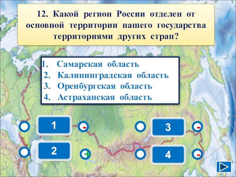 1--+-234Самарская область2.  Калининградская область3.  Оренбургская область4.  Астраханская область12. Какой регион России отделен от основной