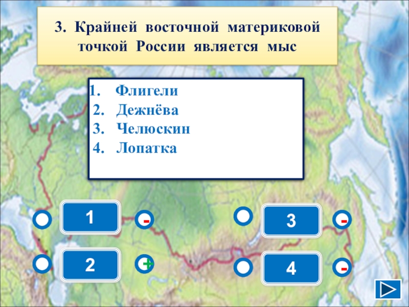 1--+-234Флигели2.  Дежнёва3.  Челюскин4.  Лопатка3. Крайней восточной материковой точкой России является мыс