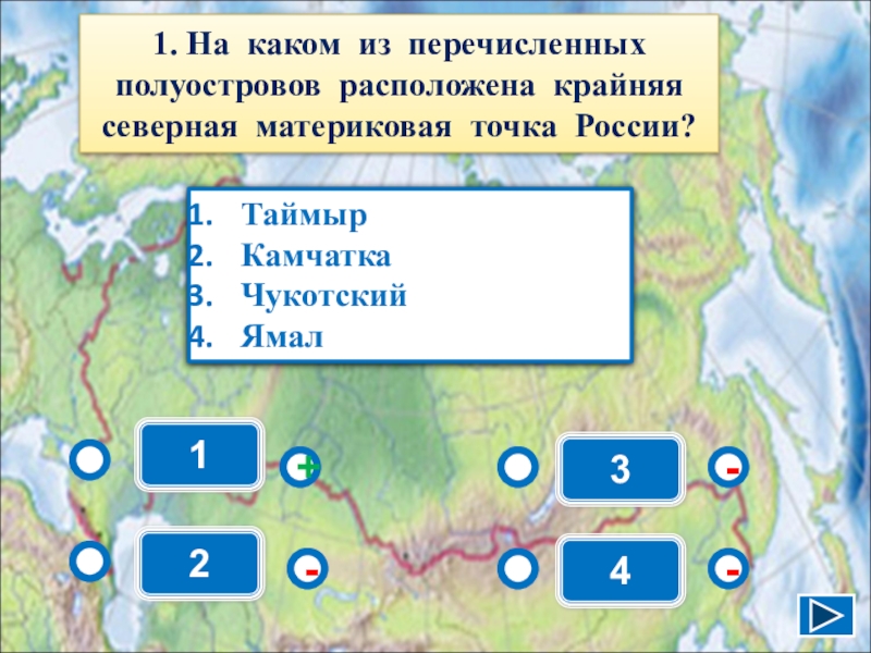 1--+-234ТаймырКамчаткаЧукотскийЯмал1. На каком из перечисленных полуостровов расположена крайняя северная материковая точка России?