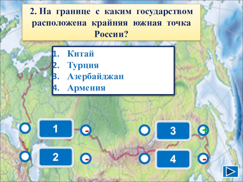 1--+-234КитайТурцияАзербайджанАрмения2. На границе с каким государством расположена крайняя южная точка России?