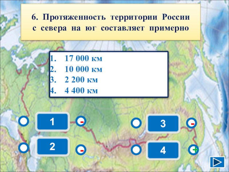 1--+-23417 000 км10 000 км2 200 км4 400 км6. Протяженность территории России с севера на юг составляет