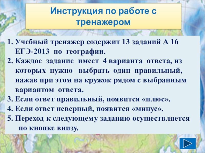 Инструкция по работе с тренажером1. Учебный тренажер содержит 13 заданий А 16 ЕГЭ-2013 по географии.2. Каждое задание имеет 4 варианта ответа, из которых нужно выбрать один правильный, нажав при этом на