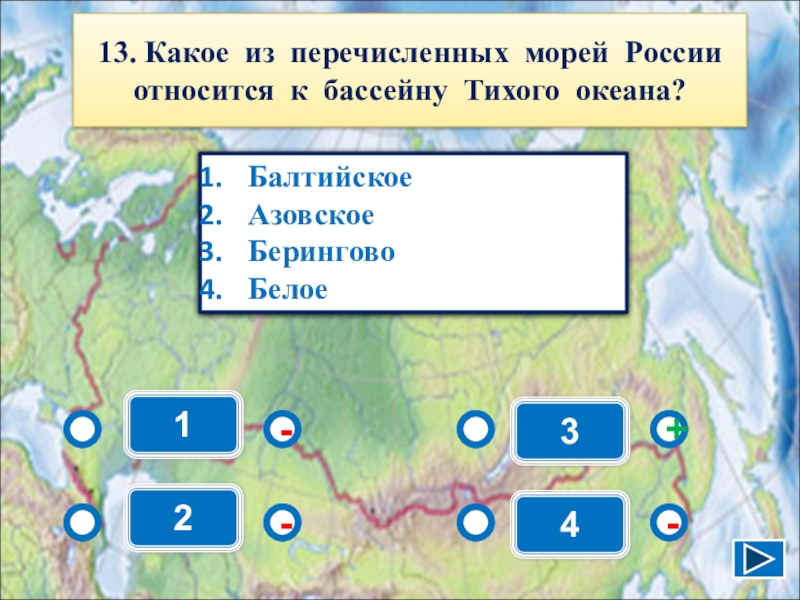 1--+-234БалтийскоеАзовскоеБеринговоБелое13. Какое из перечисленных морей России относится к бассейну Тихого океана?