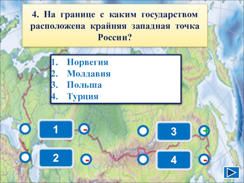 1--+-234НорвегияМолдавияПольшаТурция4. На границе с каким государством расположена крайняя западная точка России?