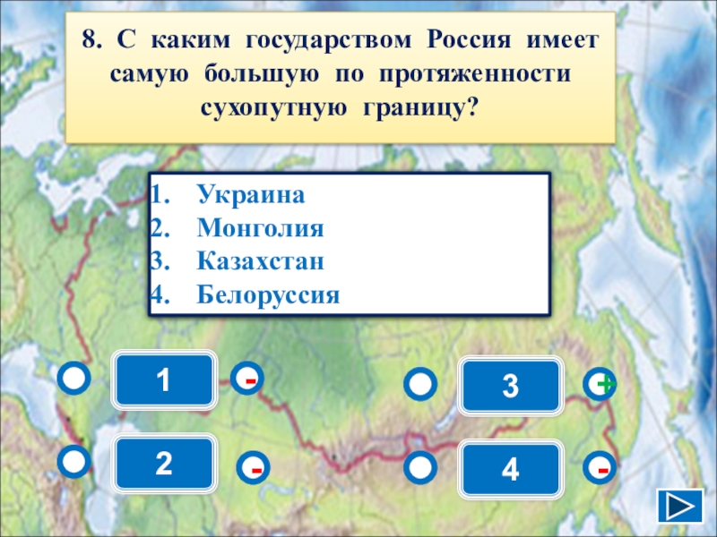 1--+-234УкраинаМонголияКазахстанБелоруссия8. С каким государством Россия имеет самую большую по протяженности сухопутную границу?