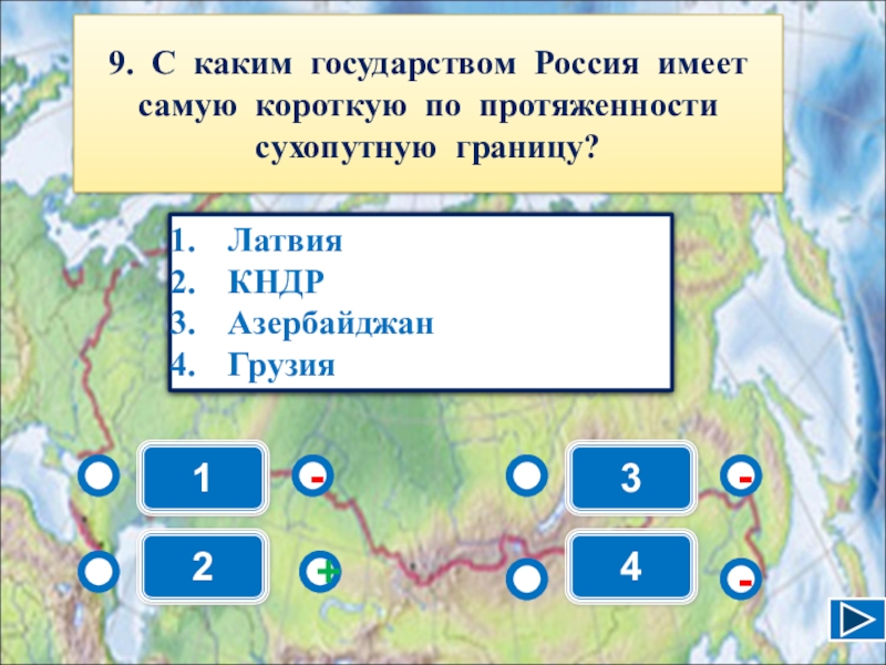 1--+-234ЛатвияКНДРАзербайджанГрузия9. С каким государством Россия имеет самую короткую по протяженности сухопутную границу?